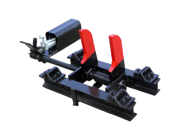 本實用新型公開了一種氣動阻車器,包括刀擋、扭簧、力把、氣缸、軸架、軸、限位板和拉桿,軸架固定在限位板上,軸的遠端穿過扭簧鉸接在軸架上,刀擋固定在軸上并與扭簧上端連接,扭簧下端固定在拉桿上,力把下端固定在軸的近端,力把上端與氣缸鉸接。該氣動阻車器結(jié)構(gòu)簡單,安全可靠,可以人工控制,也可以遠程控制,實現(xiàn)集中自動化管理。